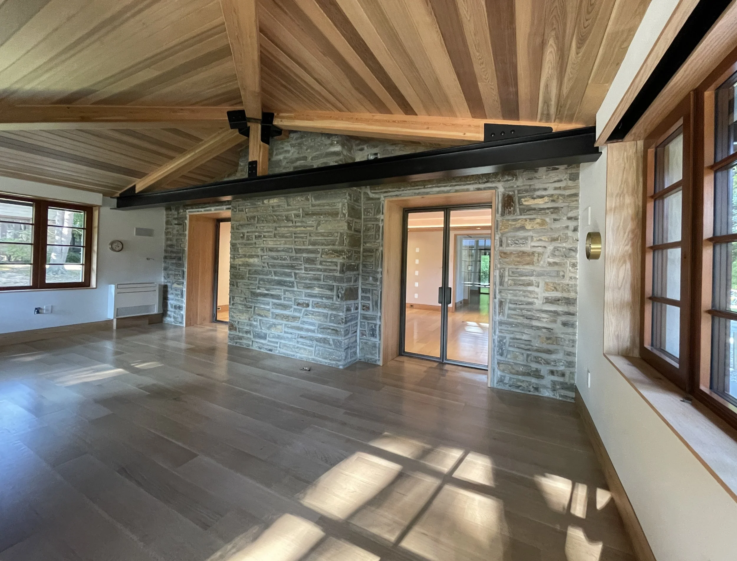 Complete gut-renovation of 1922 Horace Trumbauer-designed masonry colonial house. Complete wheelchair-accessible design included elevator and zero-step entry for all ground floor entrances, with site hardscape, drainage and integrated door details. New accessible kitchen designed with cabinetry created from felled maple tree from property. Passive house principles of continuous air sealing and continuous insulation were applied throughout. 6 kW solar array offset all-electric building energy usage. Bathrooms designed for zero-step drainage. Multiple species of wood and stone finished to maximize experience of natural textures. Views framed by triple-pane passive-house certified windows. Pure geometric forms of exterior and interior windows celebrated the movement of light throughout the day. Architecturally integrated layers of light enliven spaces at night, with a stair light illuminating newly reconstructed staircases. Additions completely rebuilt with new insulated foundations and hip roofs, relating the house to it's current street.